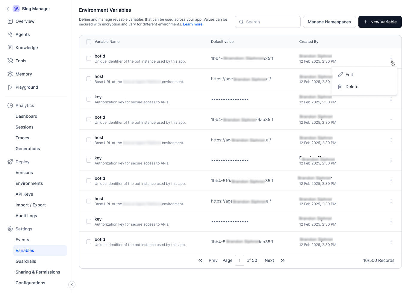 Use the Manage Namespaces option on the Variables page or when creating/editing a variable to view, create, or update namespaces.