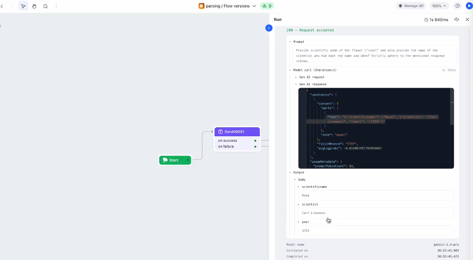 Each key from the parsed response (e.g., scientificname, year, scientist) is automatically stored in the context object of the AI node.
