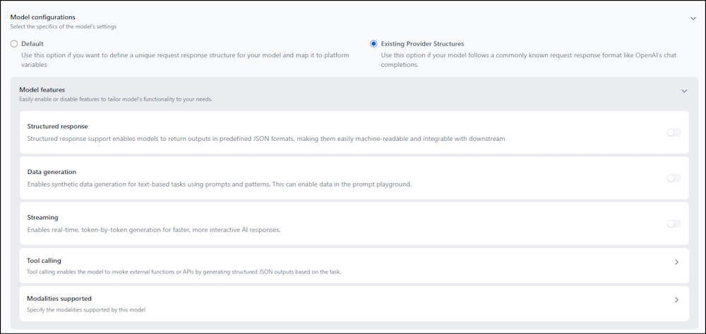 Each option determines how your model communicates with the platform and how responses are parsed. For more details, see Default and Existing Provider Structures.