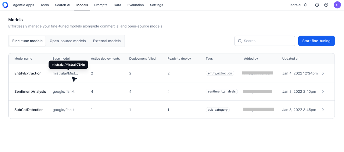 The Fine-Tuned Models tab in the Models section allows you to create, customize, and manage models fine-tuned to your specific use cases.