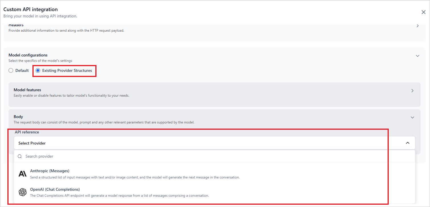 Agentic Apps also support integrating with custom third party models via API Integration.