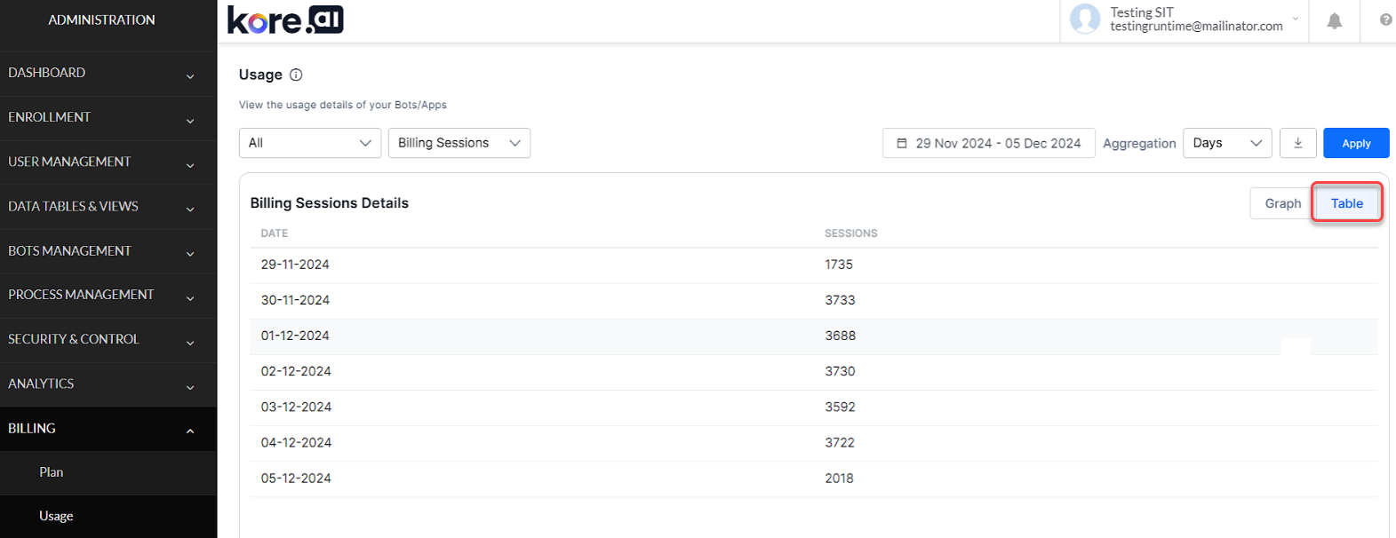 - A usage session is defined as ‘Fifteen minutes’ of user conversation with the bot. For example – If a user converses with the bot for 31 minutes, then it would be counted as 3 sessions (0-15, 16-30,31-End).