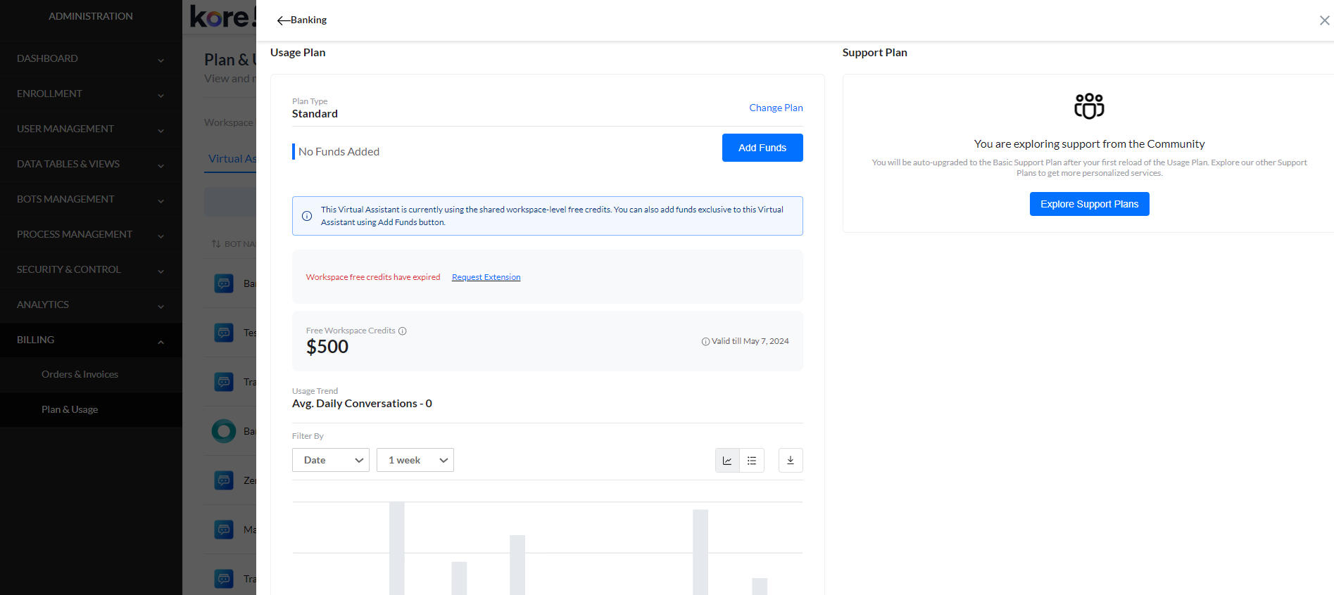 Hover over a line item to view the Manage option. The Manage option displays the current plan based on eligibility and usage details. You can change the plan, add funds, and request for extension of your plan from here.