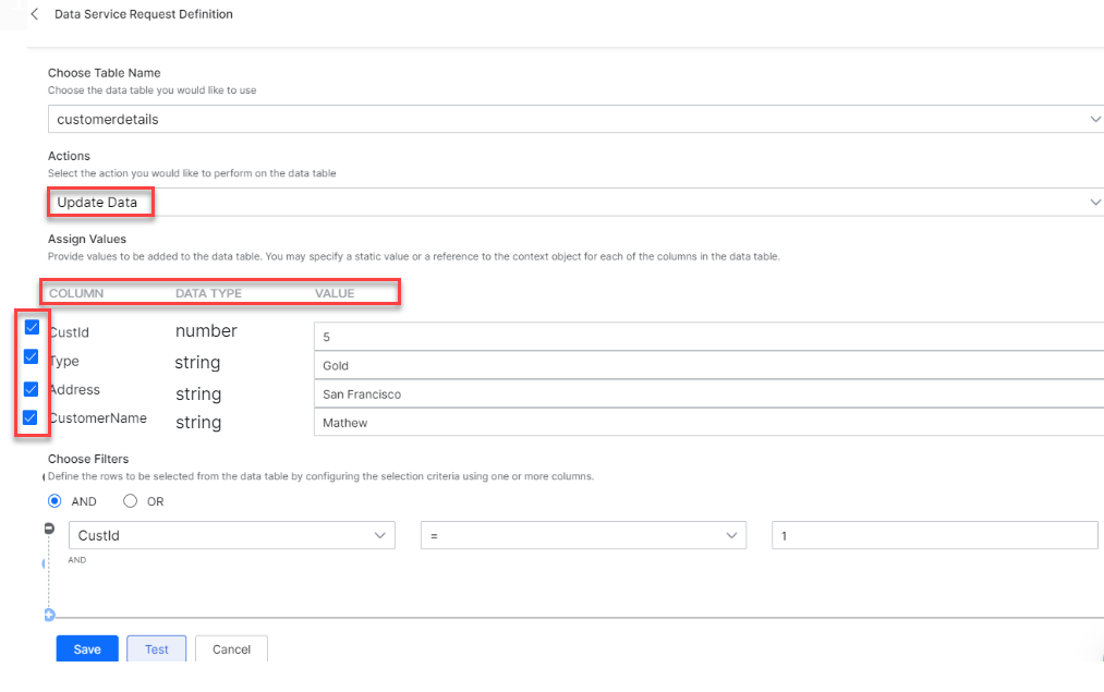 - Choose Filters to define the filter criteria to specify the rows to be updated using