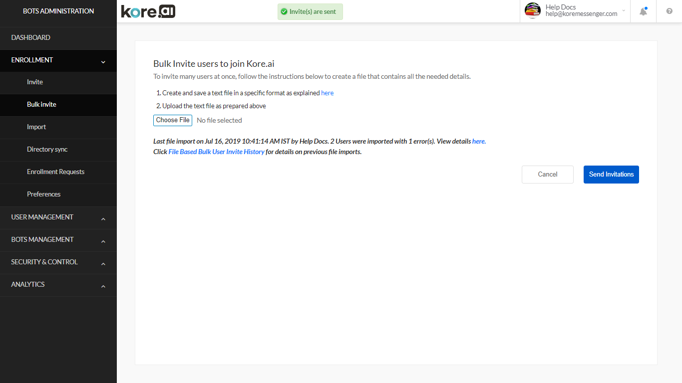 This topic describes how to upload a file that contains user email addresses to invite the users to become Kore.ai users in your account. To upload a bulk invite file: