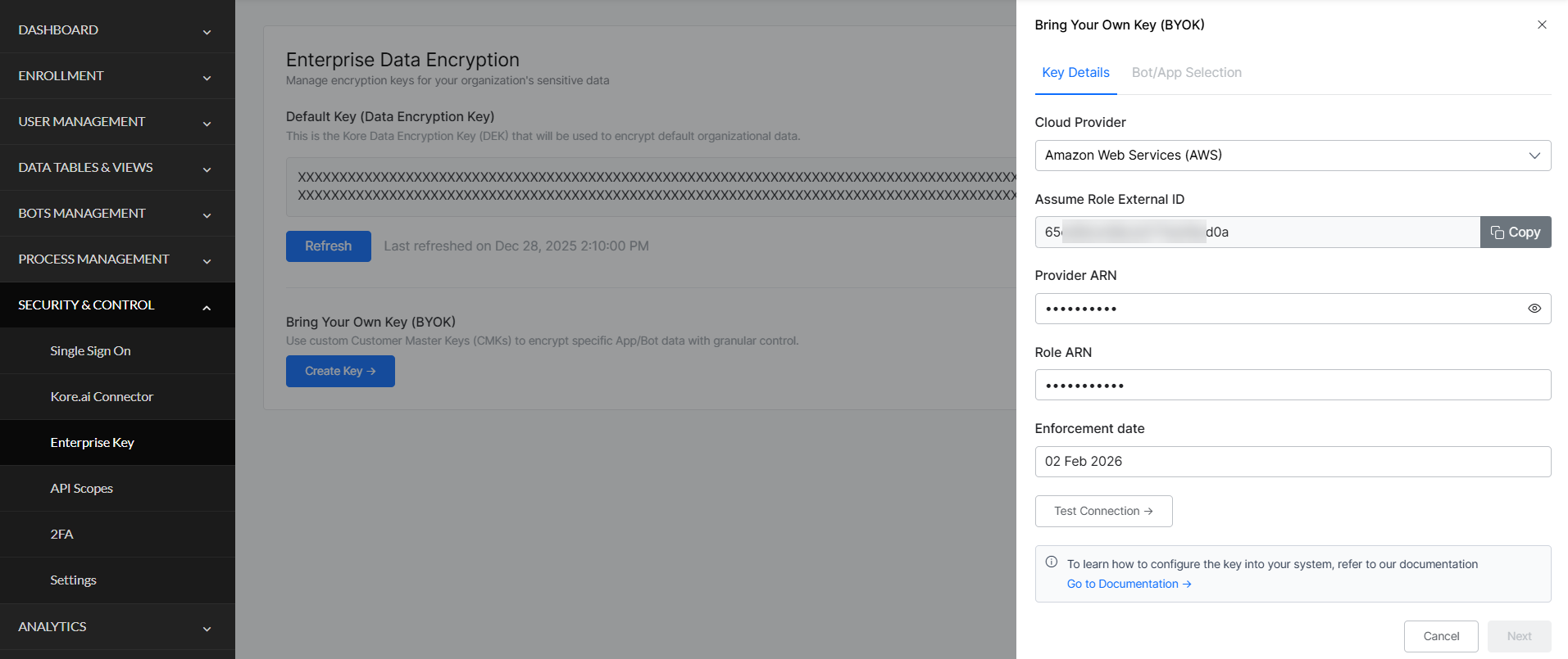 | Role ARN | The ARN of the IAM role created in your AWS account. Kore.ai assumes this role to access your KMS key. Example: arn:aws:iam::<your-account-id>:role/BYOK_Role Share this with Kore.ai after completing the steps in the Integration Process section. |