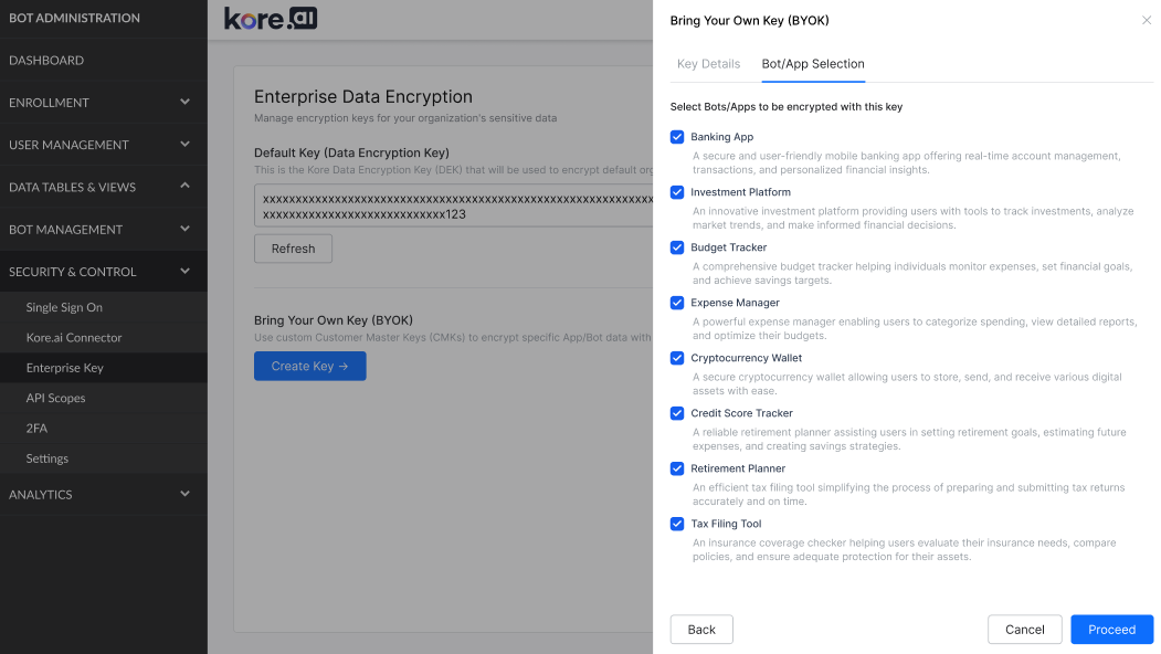 Bring Your Own Key (BYOK) encryption in Kore’s public cloud SaaS enables enterprises to retain complete control over their encryption keys while protecting sensitive data. With BYOK, organizations use their own Customer Master Keys (CMKs) to encrypt application and bot data, ensuring stronger security and compliance.