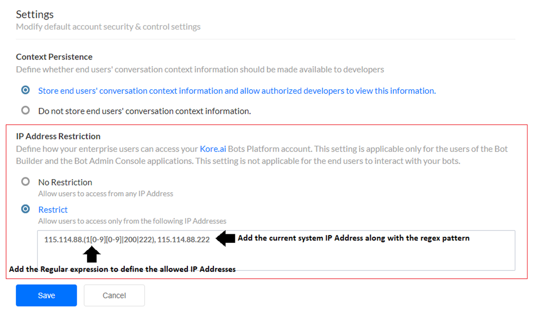 - Even if the IP address of your current system is a part of the Regex pattern, it should be added separately after the regex pattern in the Restrict text field following a comma separator. For example: 115.114.88.(1[0-9][0-9]|200|222), 115.114.88.222.