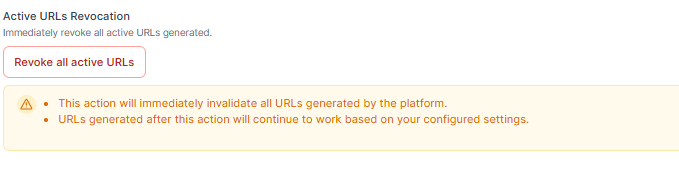 ⚠️ Warning: This action cannot be undone. Use only when an immediate revoke is required. There could be a disruption to ongoing work/flows with a dependency on these URLs.