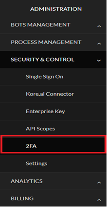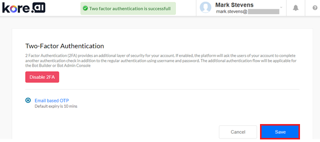 The Kore.ai Platform provides an additional layer of security for enterprise user accounts with Two-Factor Authentication (2FA) using a One-time password (OTP) or verification code via email. OTPs are a popular choice for organizations to step up their user authentication process. These randomly generated passwords are valid only for a single login session and minimize the vulnerabilities of traditional passwords.