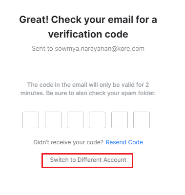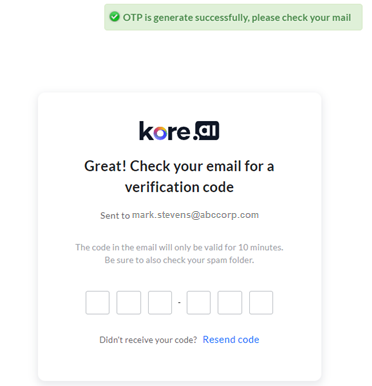 Enter the OTP verification code received via email from Kore.ai when prompted.