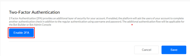 SSO authentication and 2FA are mutually exclusive on the Kore.ai XO Platform. When Enterprise SSO is enabled, 2FA is automatically disabled for that account, and vice-versa.