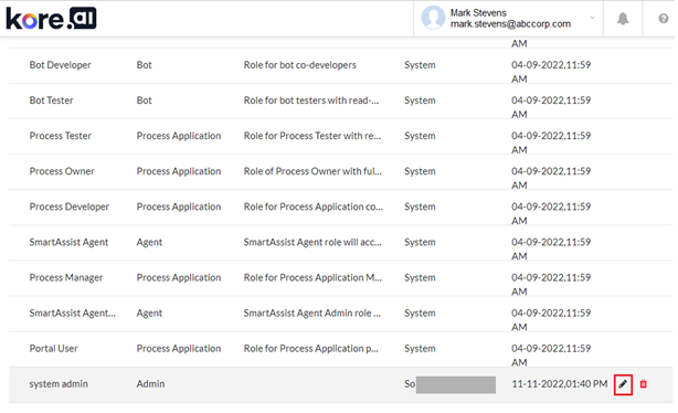 Click the edit icon of the desired Admin user’s entry to view the Manage Role window.