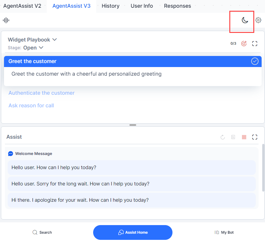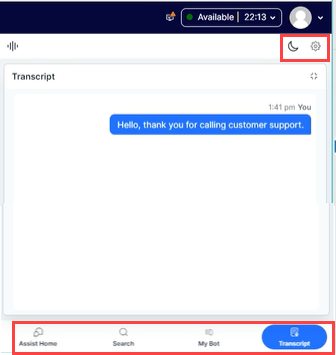 The widget consists of five tabs—Search, My AI Agent (Bot), Assist, Transcript (for Voice channel), More–and two buttons (Settings and theme) to help agents perform different tasks and activities.