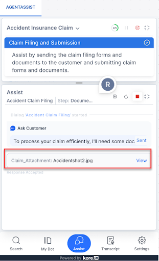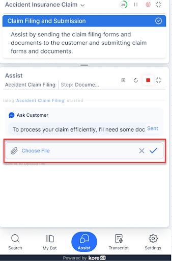 The Assist tab is the primary interface for the agents. AgentAssist actively monitors conversations and offers assistance to agents. Through the Assist tab, customer intents in the form of Dialog Tasks, FAQs, KnowledgeAI, and Playbook are identified. Agents can run automation processes and send FAQs, Playbook body text, and Dialog Task text to users. The Assist tab displays Agentic Copilot messages, Dialog Tasks, Playbooks, Agent Coaching progression, a “bulb” icon (if there is a Dynamic Playbook match), and a summary generation button. For these features to be available, they should be configured on your device. This tab accepts file or image attachments during live conversations up to the size of 25 MB. If the file or image is not automatically detected, you can override and manually attach the file. It also features the "up" and "down" arrow buttons to scroll to the first and last messages in the Assist tab (these buttons appear only after the messages in the Assist tab are large enough to require a scroll bar).