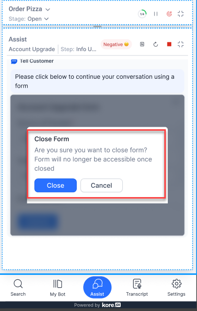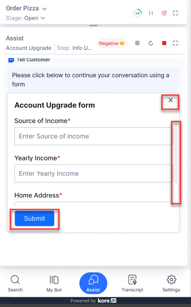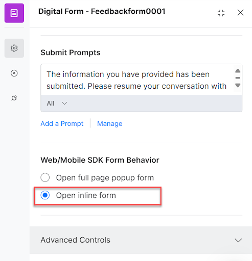 The in-line digital forms in the Assist tab lets you easily collect customer information during live conversations. To use this feature, configure the forms with dialog tasks, and select “Open inline form” in the Web/Mobile SDK Form Behavior setting.