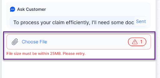 AgentAssist accepts file or image attachments during live conversations. If the file or image is not automatically detected, you can override and manually attach the file. To maintain system efficiency, attachments are limited to one file at a time and must not exceed 25 MB in size.