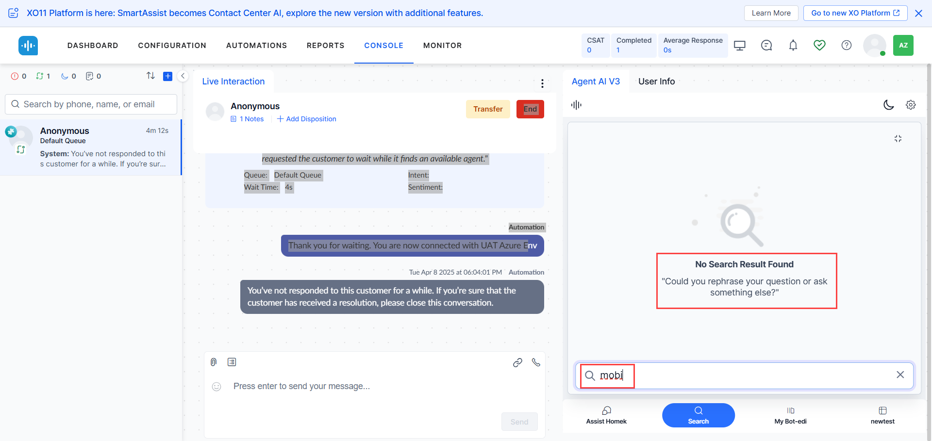 My AI Agent (Bot) tab displays the list of “next best action” suggestions for the agent based on the current conversation status and other interaction parameters.