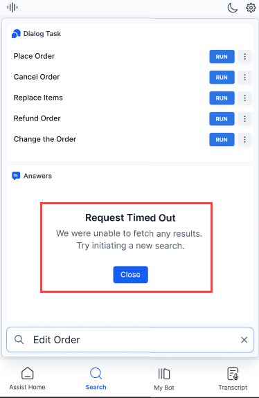 The Search tab displays error messages for searches exceeding 10 seconds, dialog tasks not configured, and server issues.