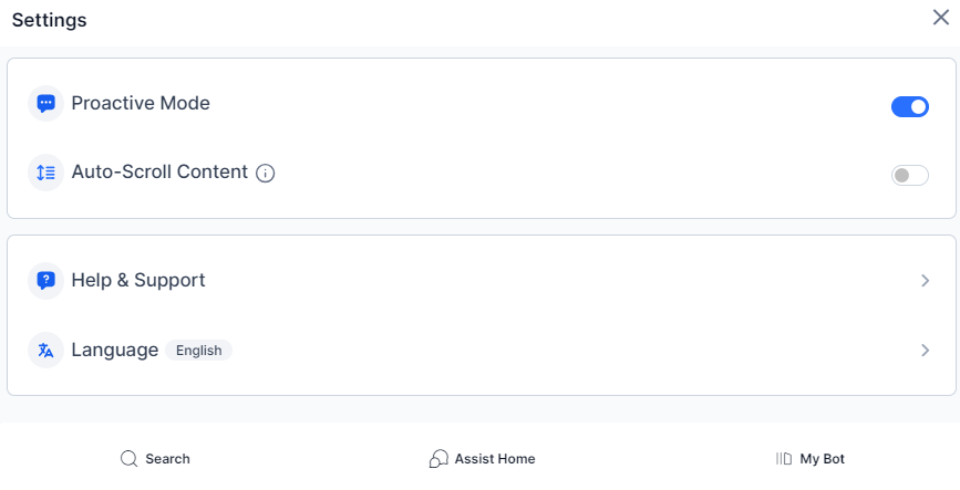 The Auto-Scroll Content toggle lets you manage the scrolling functionality of content in the Assist, My AI Agent (Bot), and Transcript tabs. You can turn on or off the toggle, as required.