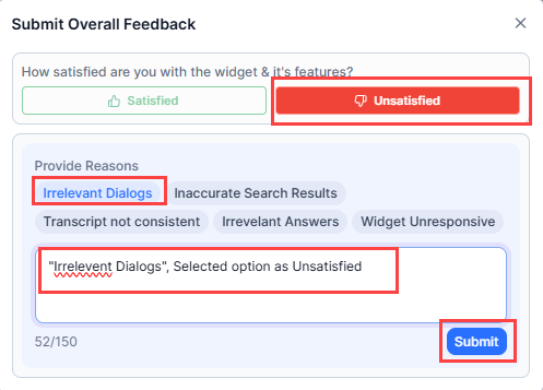 Select the feedback messages from the list, and enter any additional comments. In the following screenshot, agent has selected the Unsatisfied tab, the Irrelevant Dialogs message, and entered a comment: