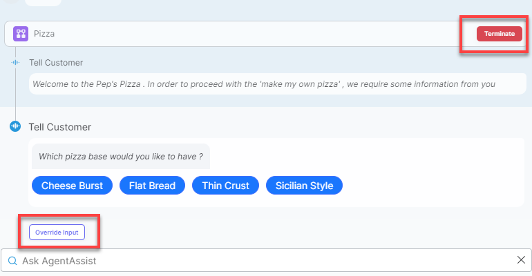 - Termination button: This button provides agents options to handle ongoing interactions effectively, allowing them to either terminate, cancel, or continue, which involves manual input of customer responses for entity responses.
