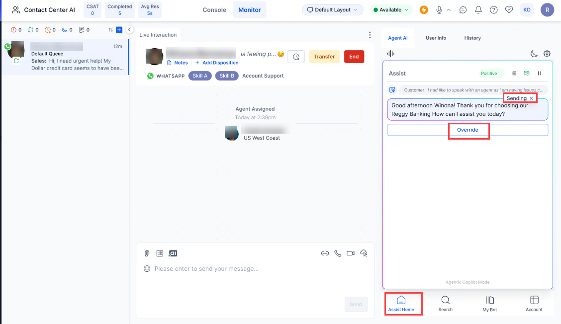 Agentic Copilot messages: The messages appear with a “Sending” button that delays auto-send for up to 10 seconds, based on the value set in the Set message delay before auto send field in the Agent AI Widget Settings section). During this time, Agents can click the x icon next to the sending button to cancel auto-send and choose to send or copy the message manually.