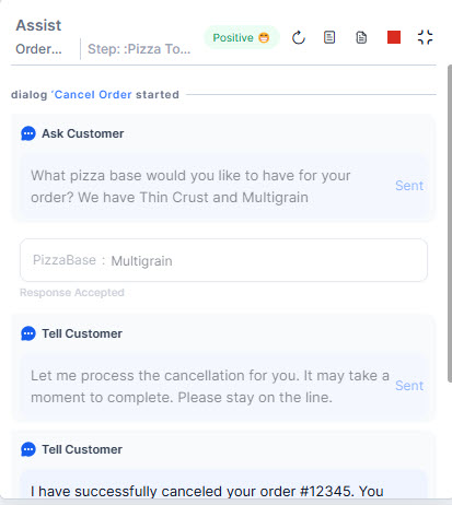 - Restart button: When clicked, this button provides agents with two options: "Start over" and "Restart with Captured Inputs." These options allow agents to either restart the Dialog Task or continue it by providing input for each entity before restarting.