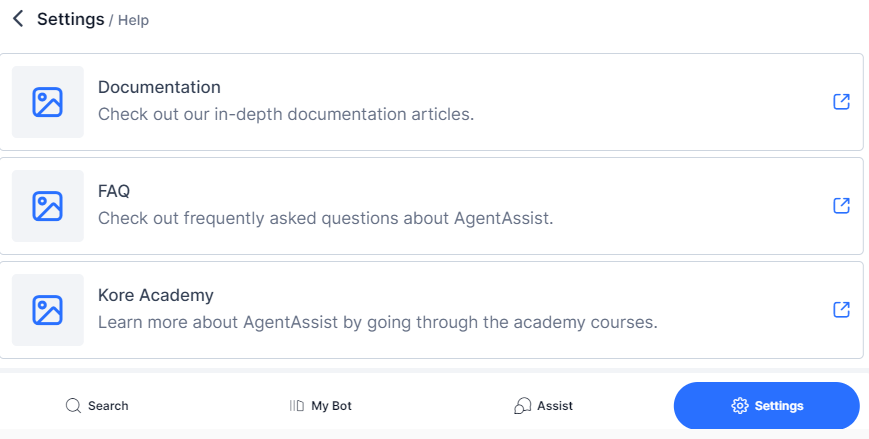 This section gives you access to the available documentation, FAQs, and the Kore Academy courses. You can refer to these materials to answer questions or give reference to these to the customer.