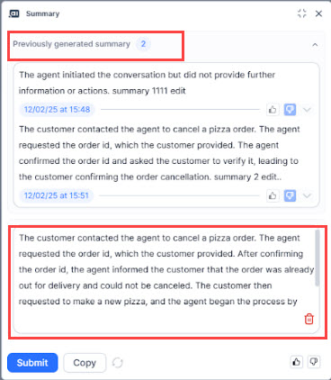 - Generate Summary: Empowers agents to generate on-demand summary up to two times per agent, per conversation. This functionality is available even during agent transfers, allowing the receiving agent to regenerate a new summary and view the previous summary with timestamps.