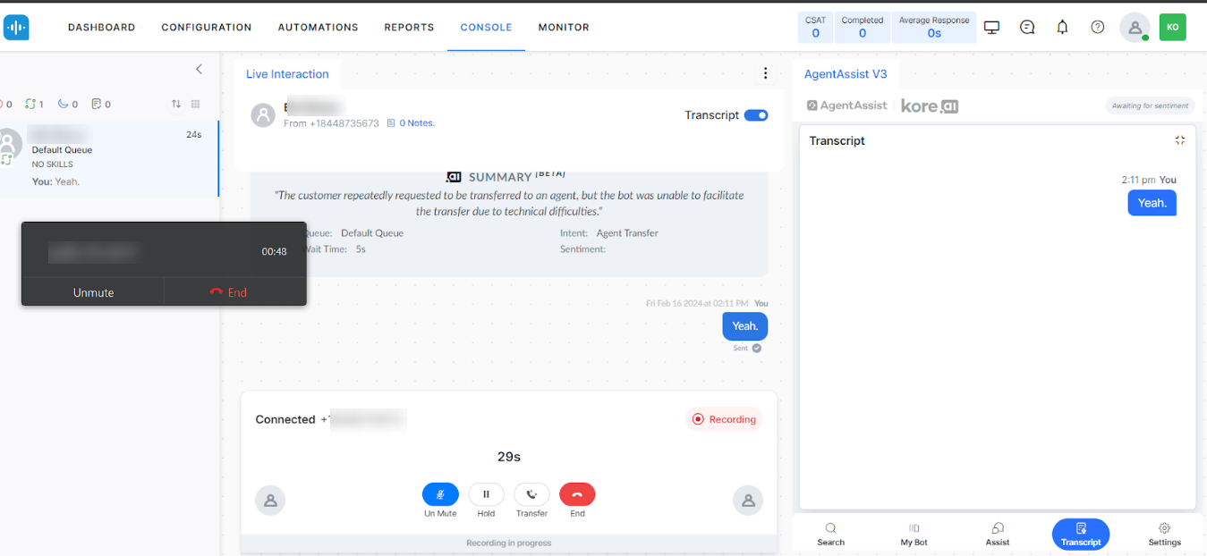 - PII Redaction: Securely removes Personally Identifiable Information (PII) from the agent's view and transcripts, ensuring a safe environment for customer interactions and compliance with privacy regulations.