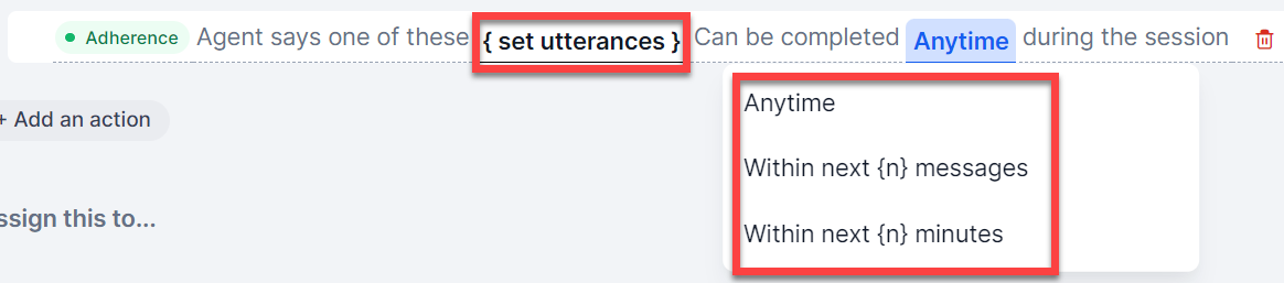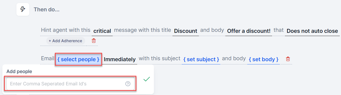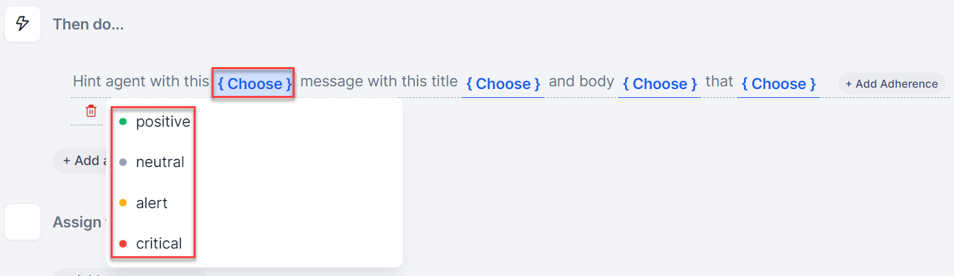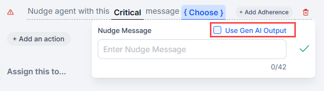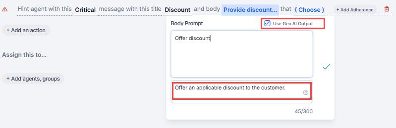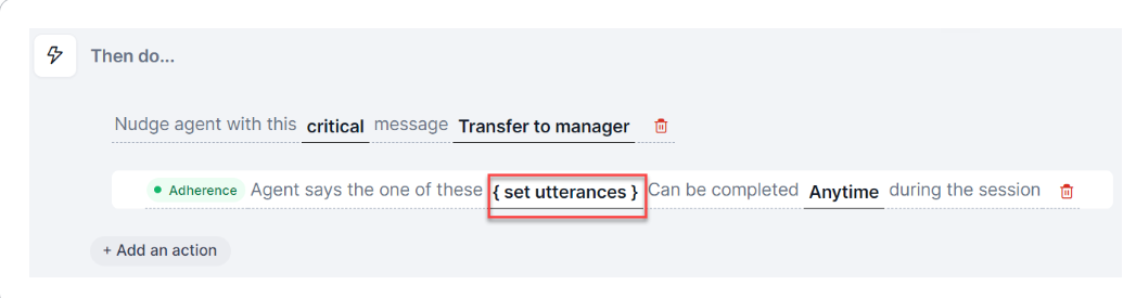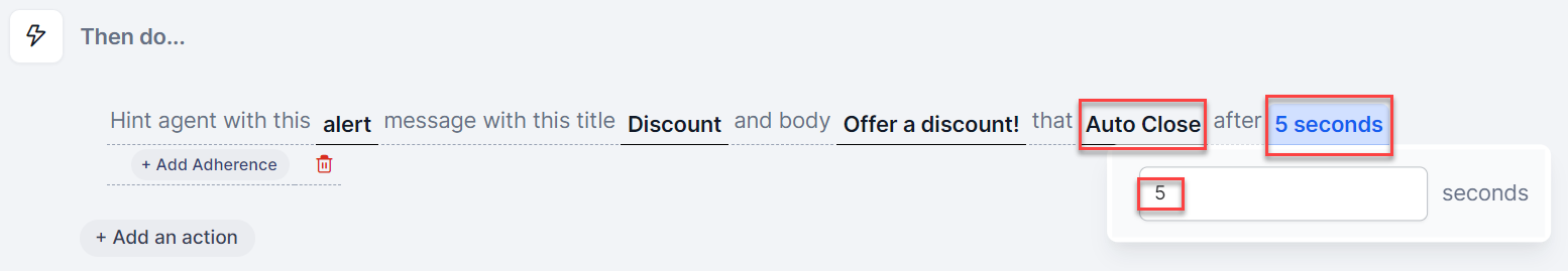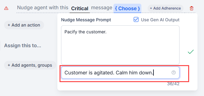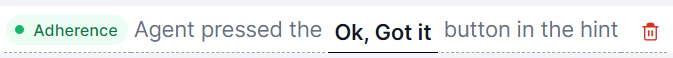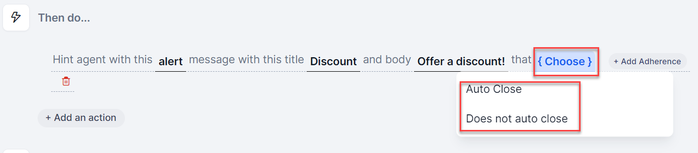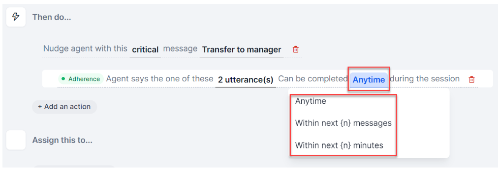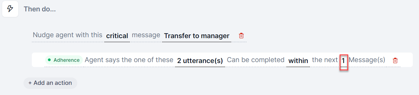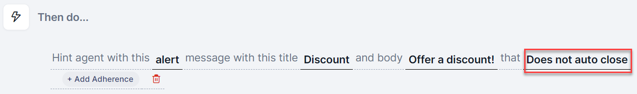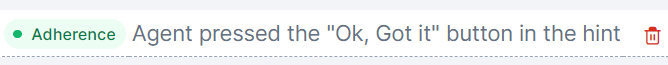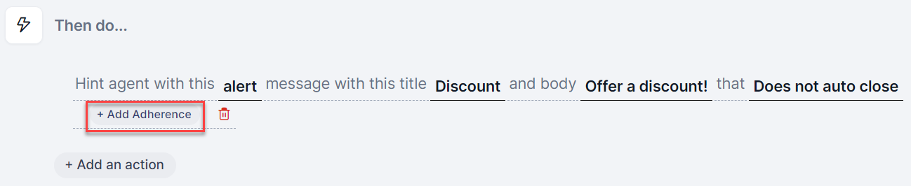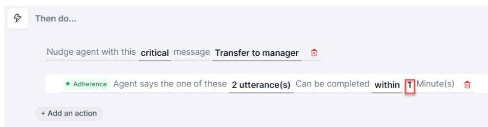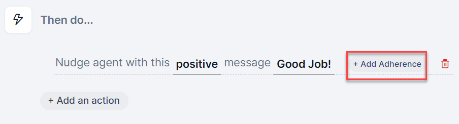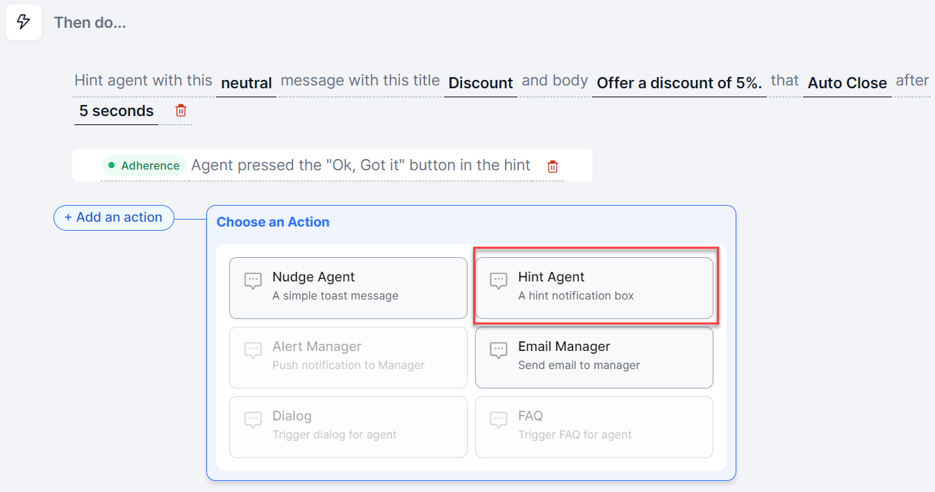 The Add Adherence feature lets you know the agent’s adherence to the instructions in the form of nudges and hints. Later, you can use this acknowledgment to measure agent performance in the Dashboard. This feature is applicable only for the Nudge and Hint Agent actions.
