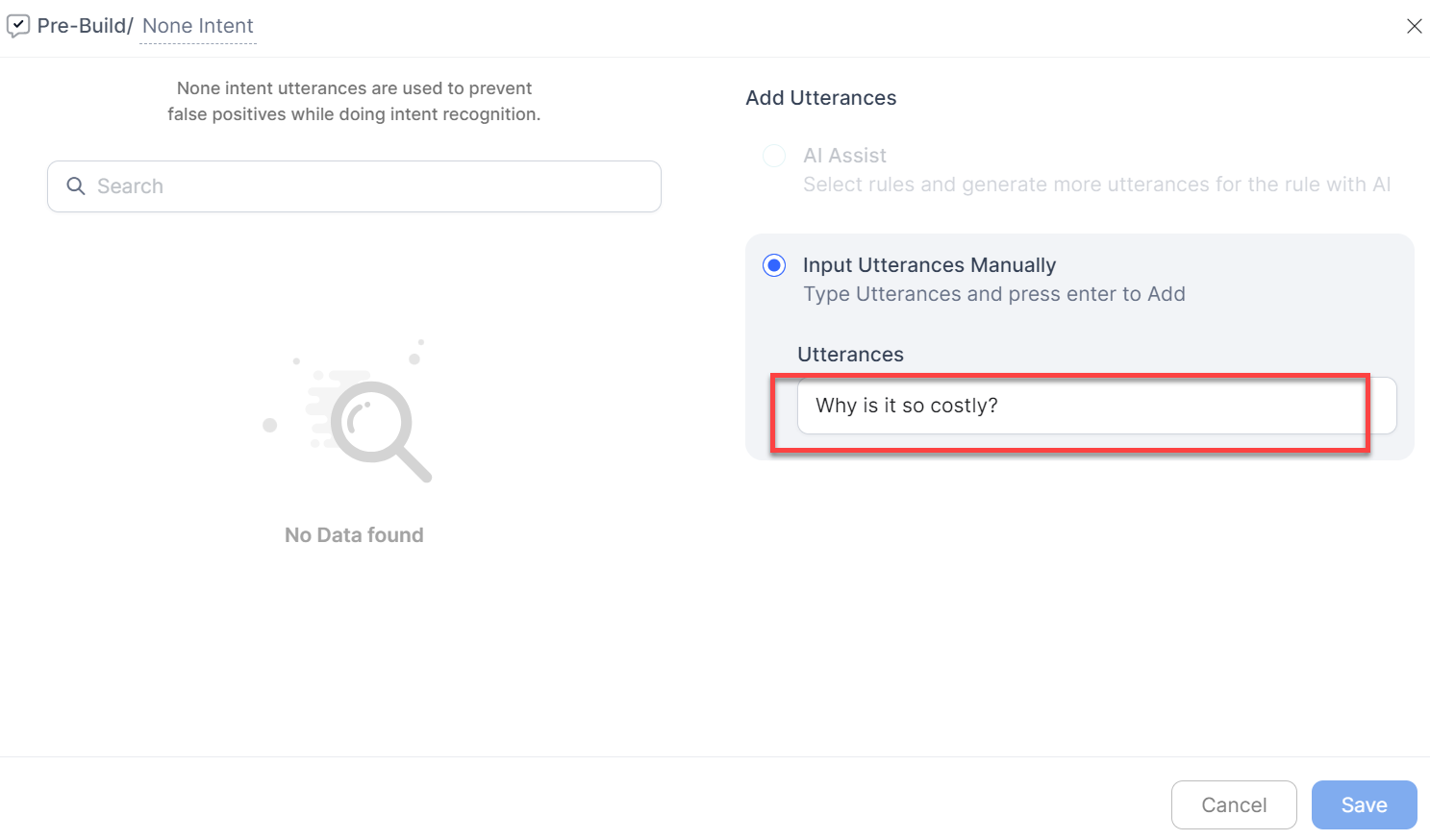- Input Utterances Manually: You can manually enter and save none intent utterances.