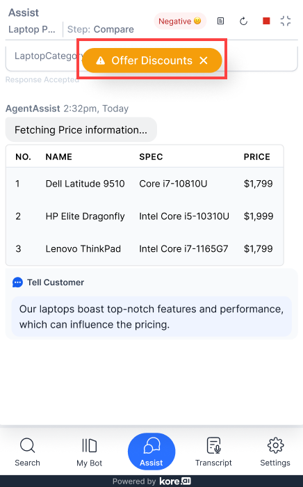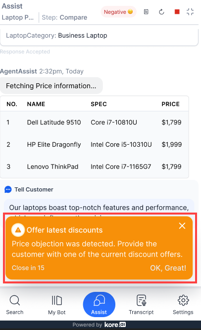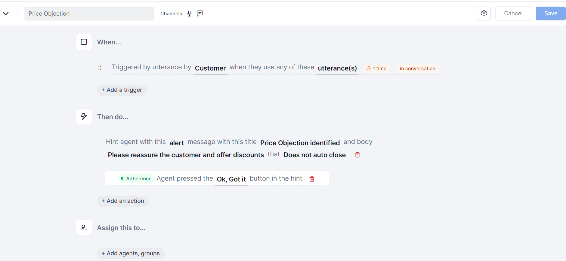 This is a predefined rule with conditions and actions that come with Agent Coaching. You can customize the conditions and actions, but can’t edit or delete the rule name. However, you can disable this rule, if needed. It contains a customer’s price objection utterance and defines the actions agents should take in response. The predefined conditions and actions are: