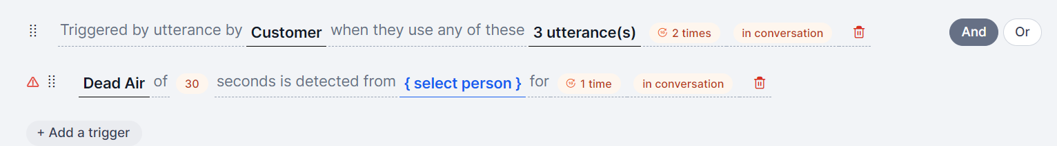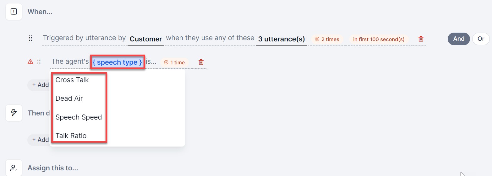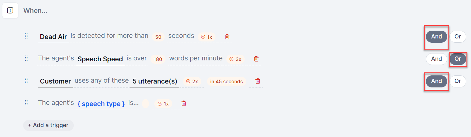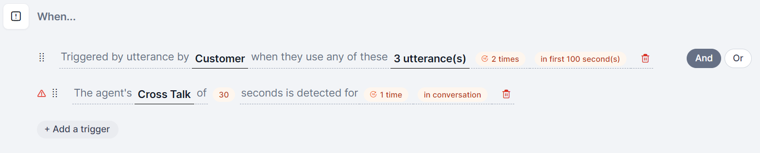 AgentAssist allows you to add multiple rule triggers. It lets you set different conditions like combining multiple rules or choosing one or a set of rules against another or a different set of rules. You can even choose or combine rules from different trigger types like Utterance and Speech Analysis triggers.