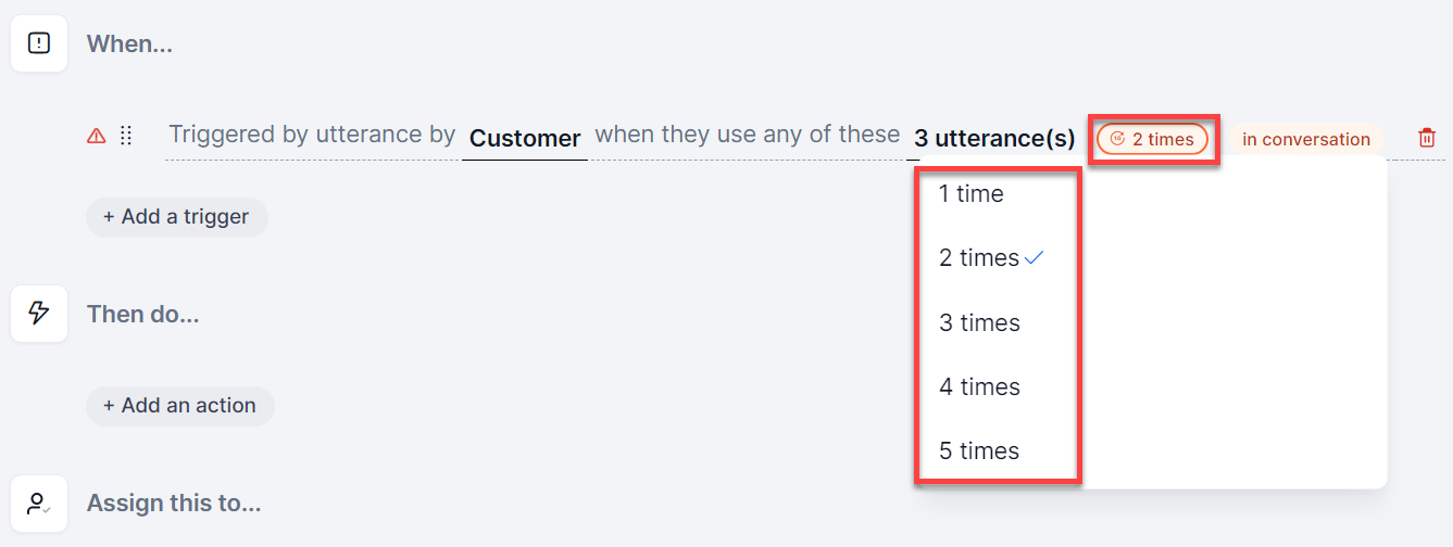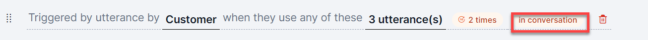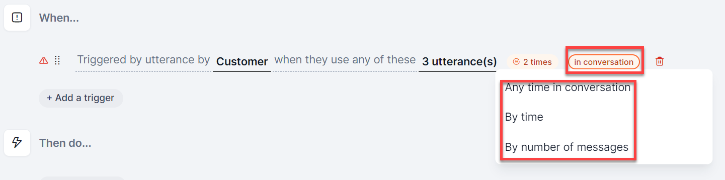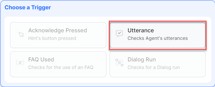 Utterances are inputs from customers and agents. In Utterance Triggers, you set up conditions like input from customers or agents, the number of times the input came, and the time frame within which the input came to set off the trigger.