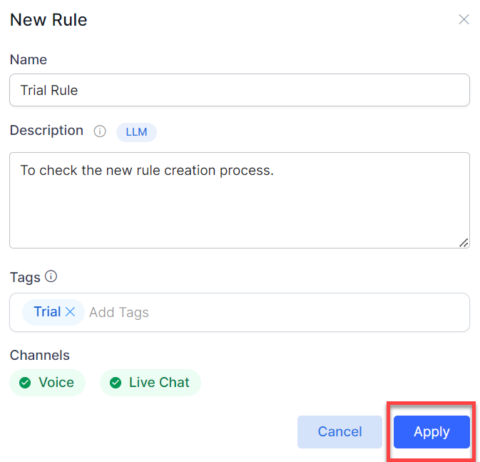 - Both: Choose both Voice and Live Chat if you want this rule to take input utterance through both these mediums.