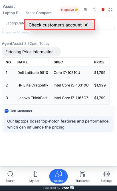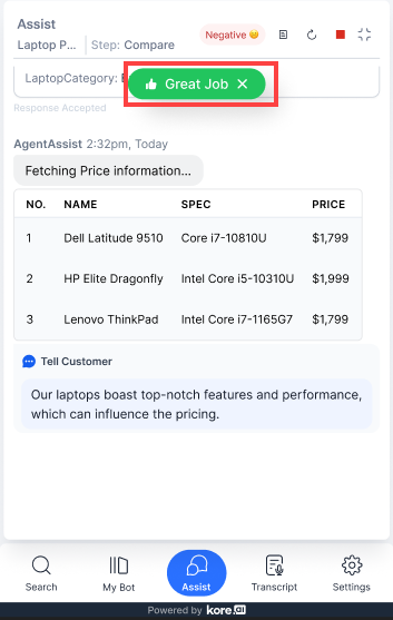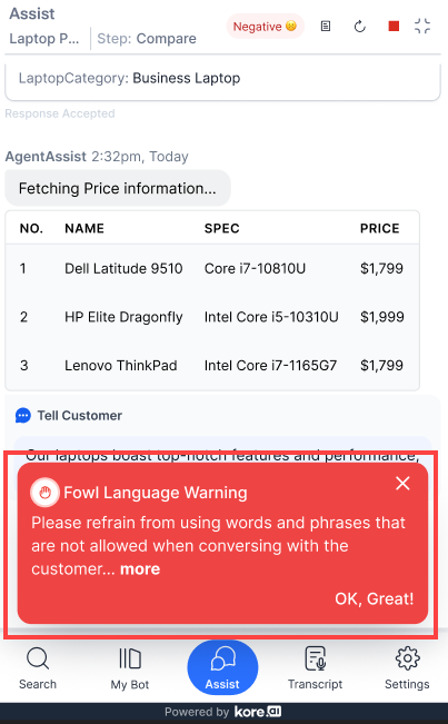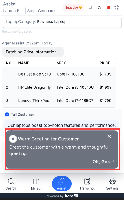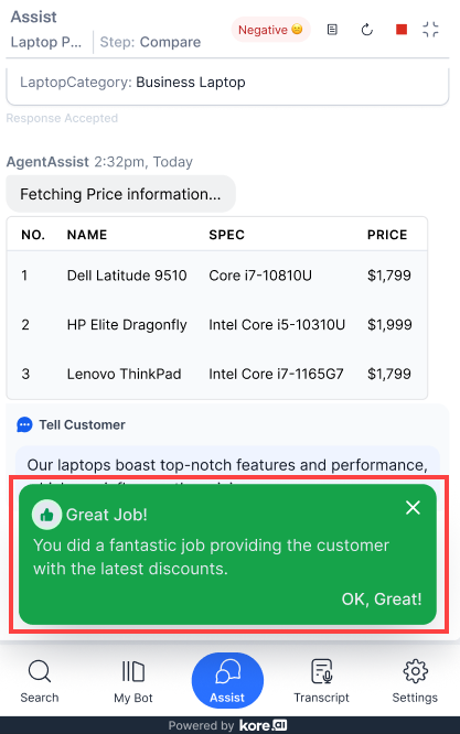 The Nudge Agent actions are the small messages that pop up on the agent’s screen while communicating with customers. These are disappearing messages that stay on the agent’s screen for five seconds. Agents can close these messages anytime after their appearance. Through these messages, you either compliment the agents for a good job or direct them to take other appropriate actions to serve the customers in the best way possible. You can use Gen AI to generate nudge messages based on your prompt. Here are the four nudges to select from: