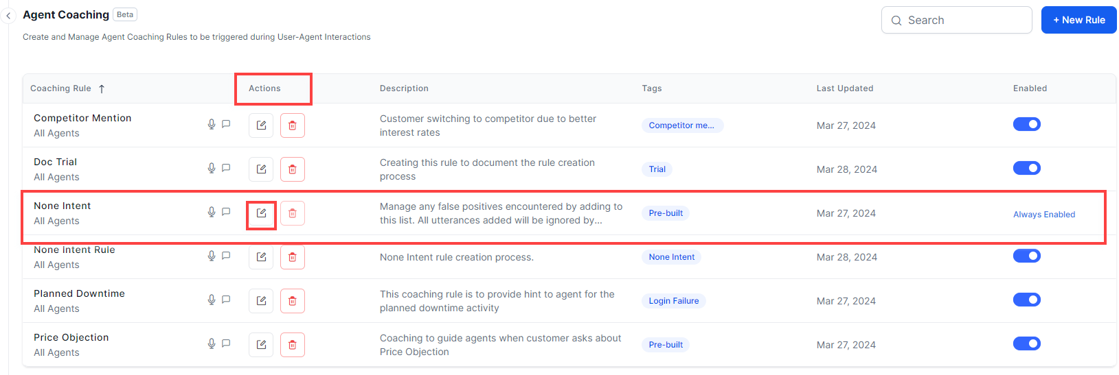 Currently, the pre-built rules section has two rules – None Intent and Price Objection.