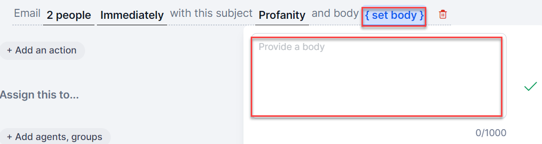 Click Add agents, groups under Assign this to… to add agents or groups you want to assign this rule to. For more info, refer to the Assign This to section.