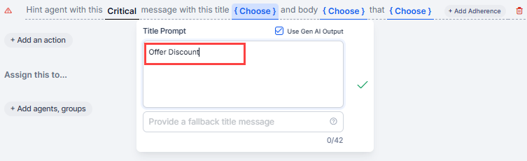 The Hint Agent actions are small pop-up messages that advise agents to take further action. They appear on the agent’s screen while communicating with the customers and may or may not auto-close, based on how you set them. Through these messages, you also compliment the agents for a good job. You can use Gen AI to generate the title and message body based on your prompt. Here are the four hint types that you can choose from: