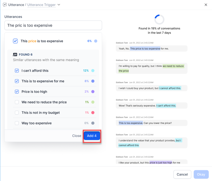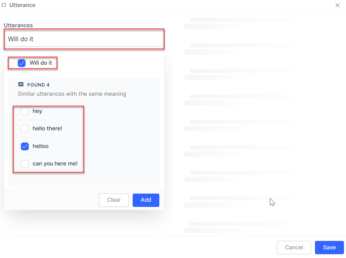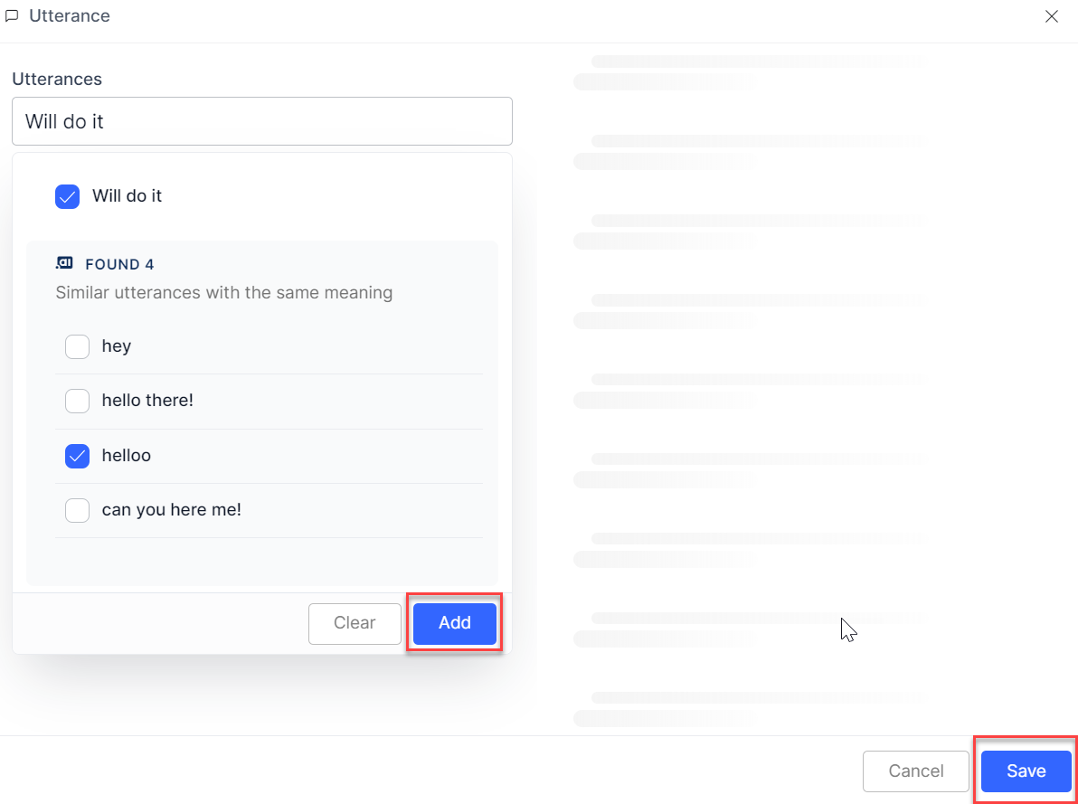 Type and select the utterance. You can select similar utterances from the Utterances list.
