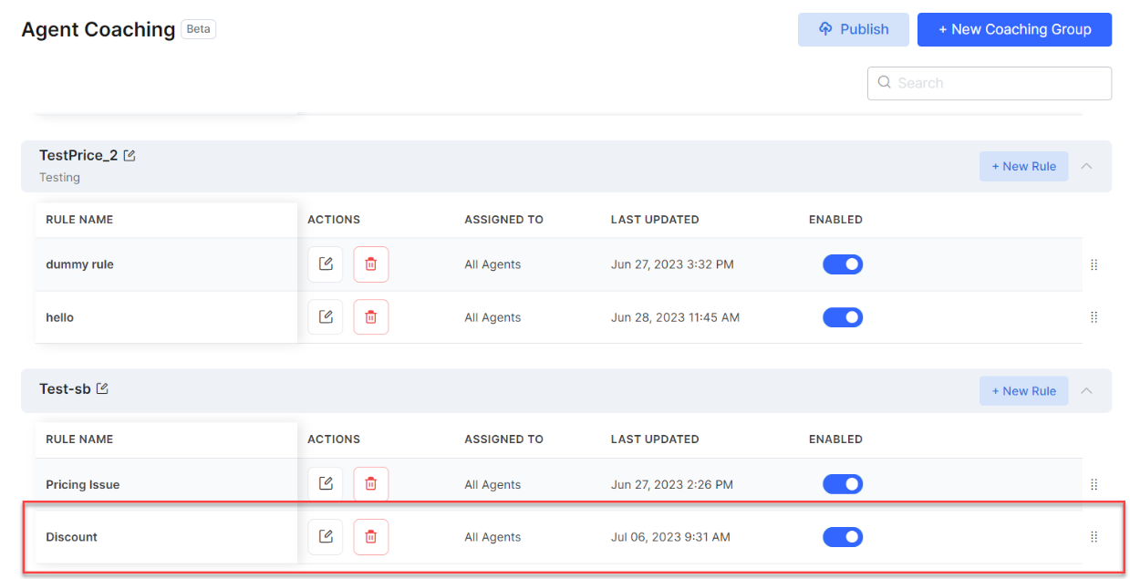 You can delete a rule due to irrelevance or other reasons. AgentAssist lets you delete an existing rule with the click of a button.