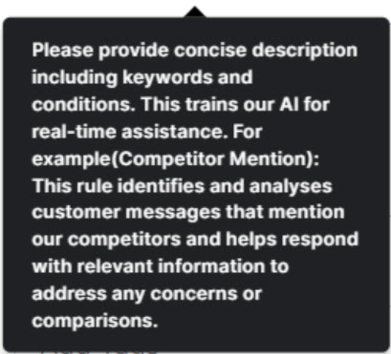 Rule description should be concise and include keywords and conditions. It trains the AI for real-time assistance. -