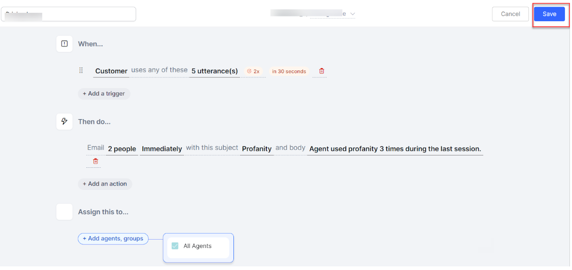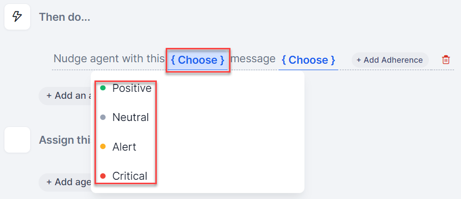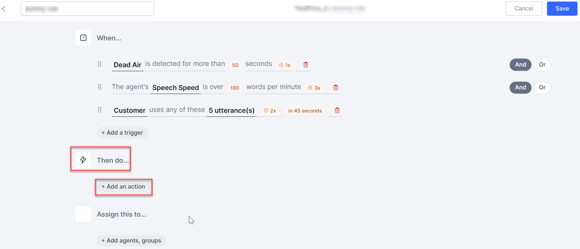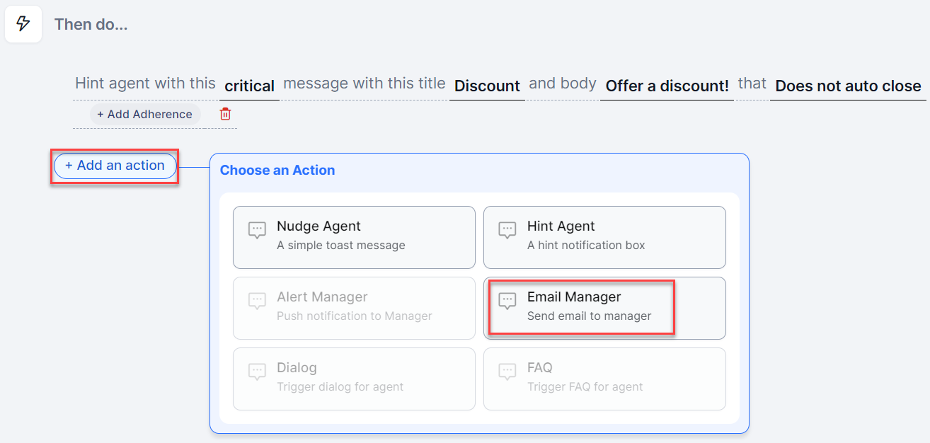 Click +Add an action under Then do… to add an action for the rule. For more info, refer to the Agent Real time Coaching Actions Then do... section.