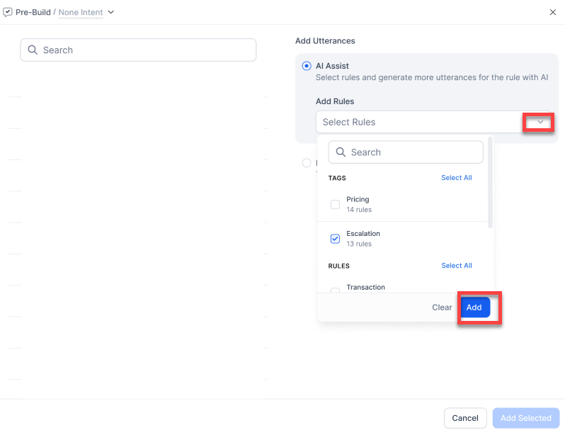 - AI Assist: You can take assistance from AI to generate and add more none intent utterances based on the utterances of your selected rules.