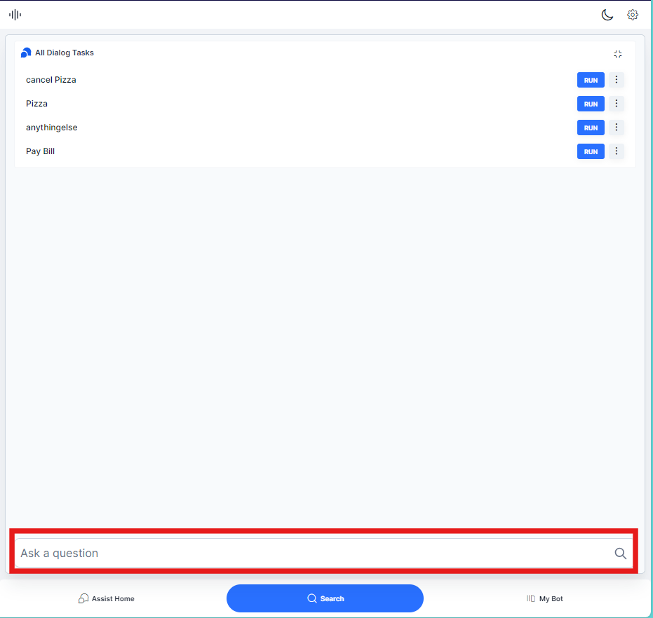 - Run button: For Dialog Tasks. Click to run a configured Dialog Task.