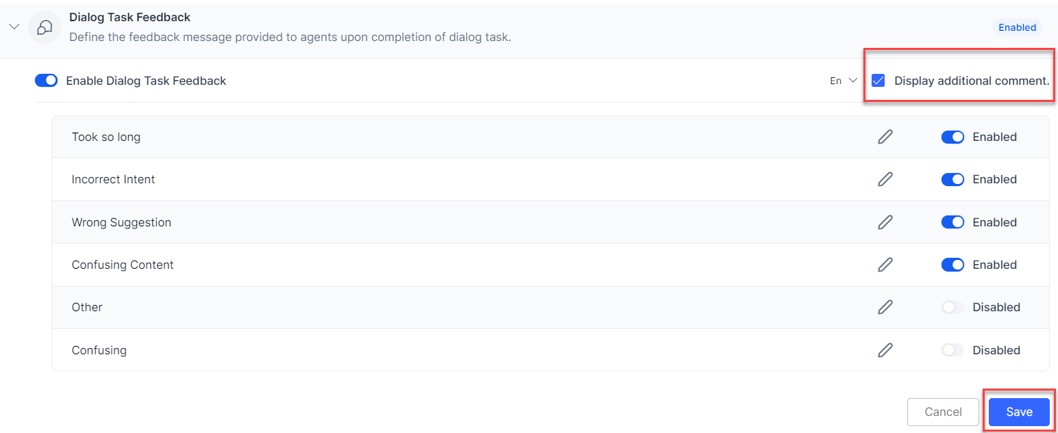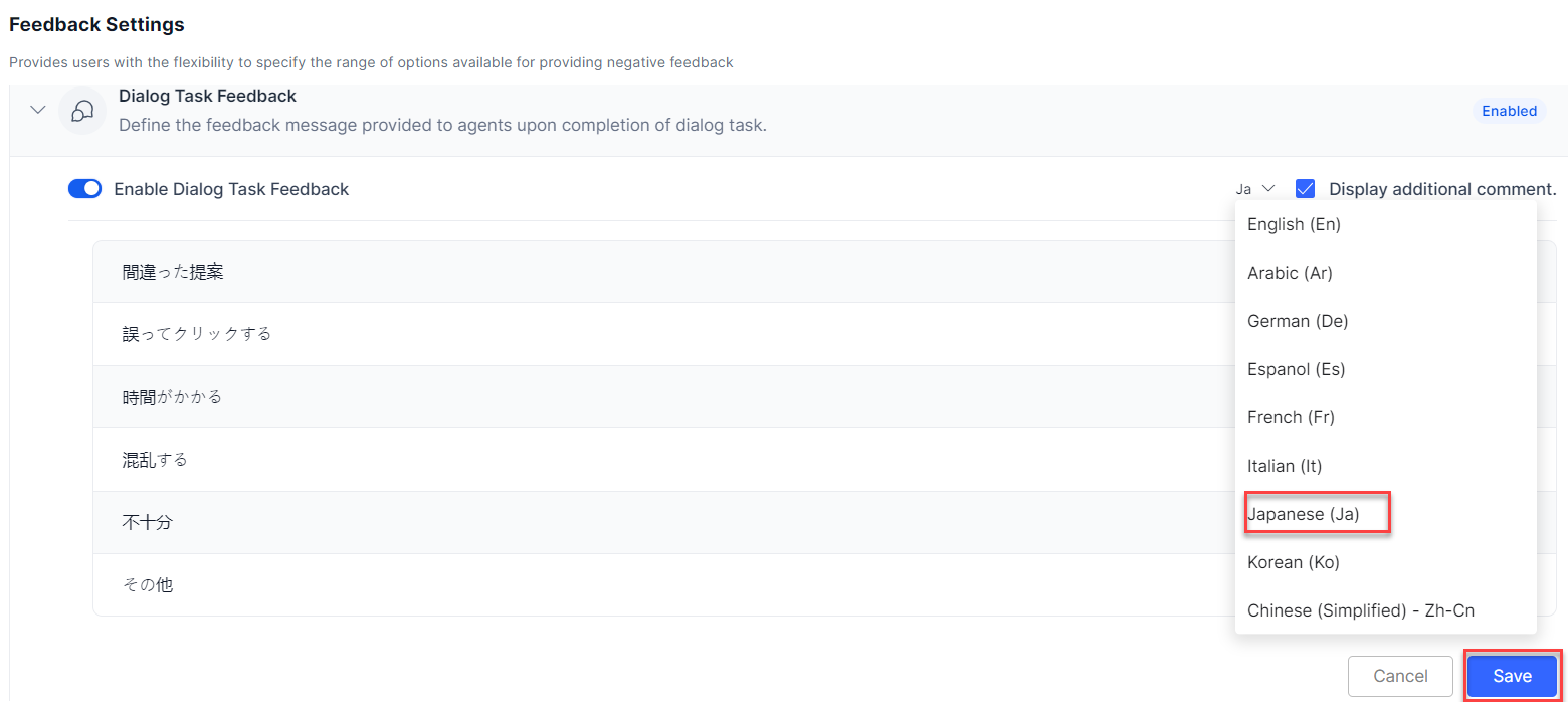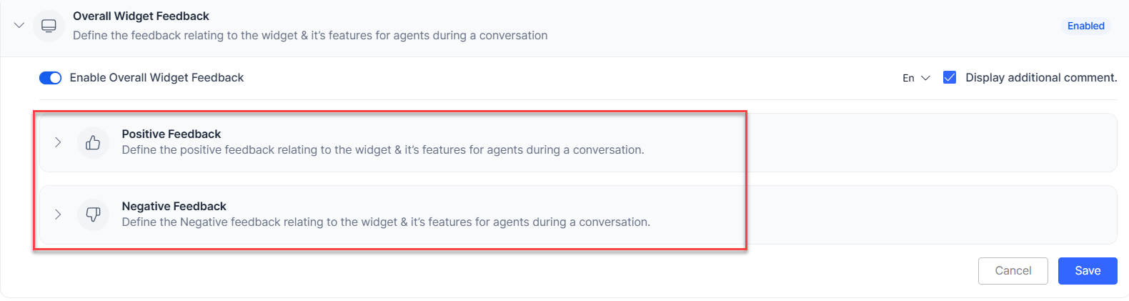 - Context-Specific Feedback: Configure up to six predefined negative feedback messages for Agentic Feedback, Dialog Tasks, Answers, FAQs, and Summaries, but turn on only five per subsection at a time. To turn on a sixth, you must first turn off another. These options appear in the widget after agents select the thumbs-down icon in the Agent AI widget. You can edit these messages (limited to 25 words each), include a comment box for any additional input, and set the display language.