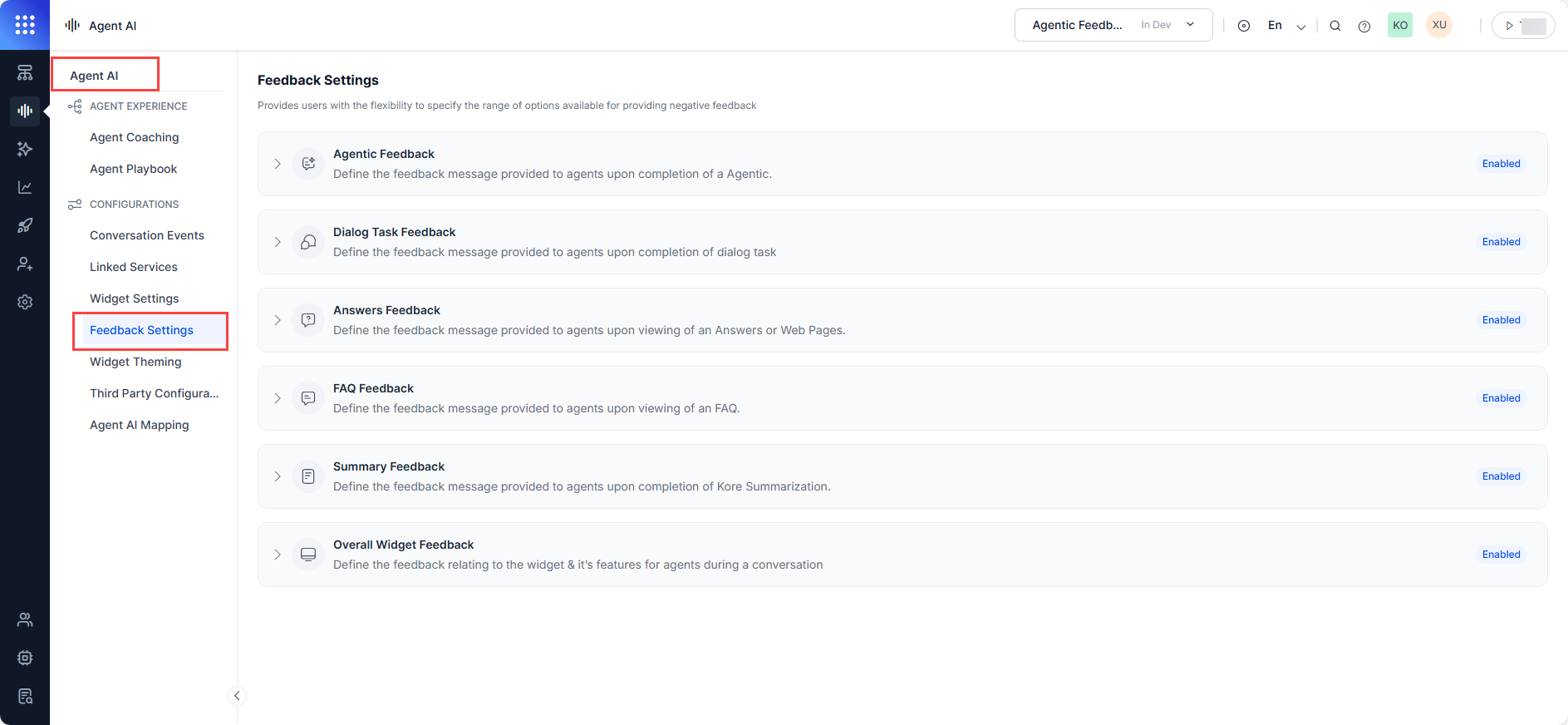 - Click to expand any subsection – Agentic Feedback, Dialog Task Feedback, Answers Feedback, FAQ Feedback, Summary Feedback, or Overall Widget Feedback.