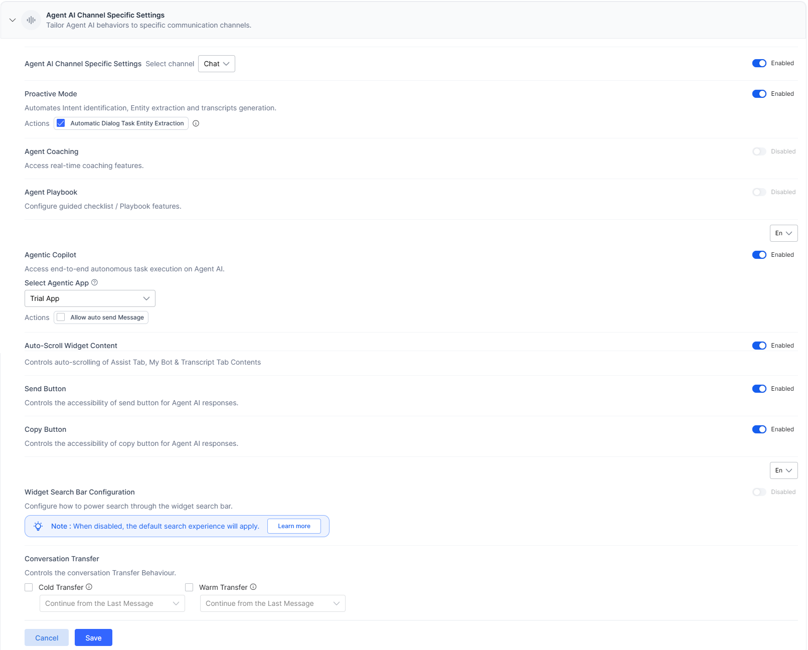 - Turn the toggle on or off for the Agent Coaching, Agent Playbook, Agentic Response Streaming, Auto-scroll widget content, Send Button, and Copy button fields, as required.
